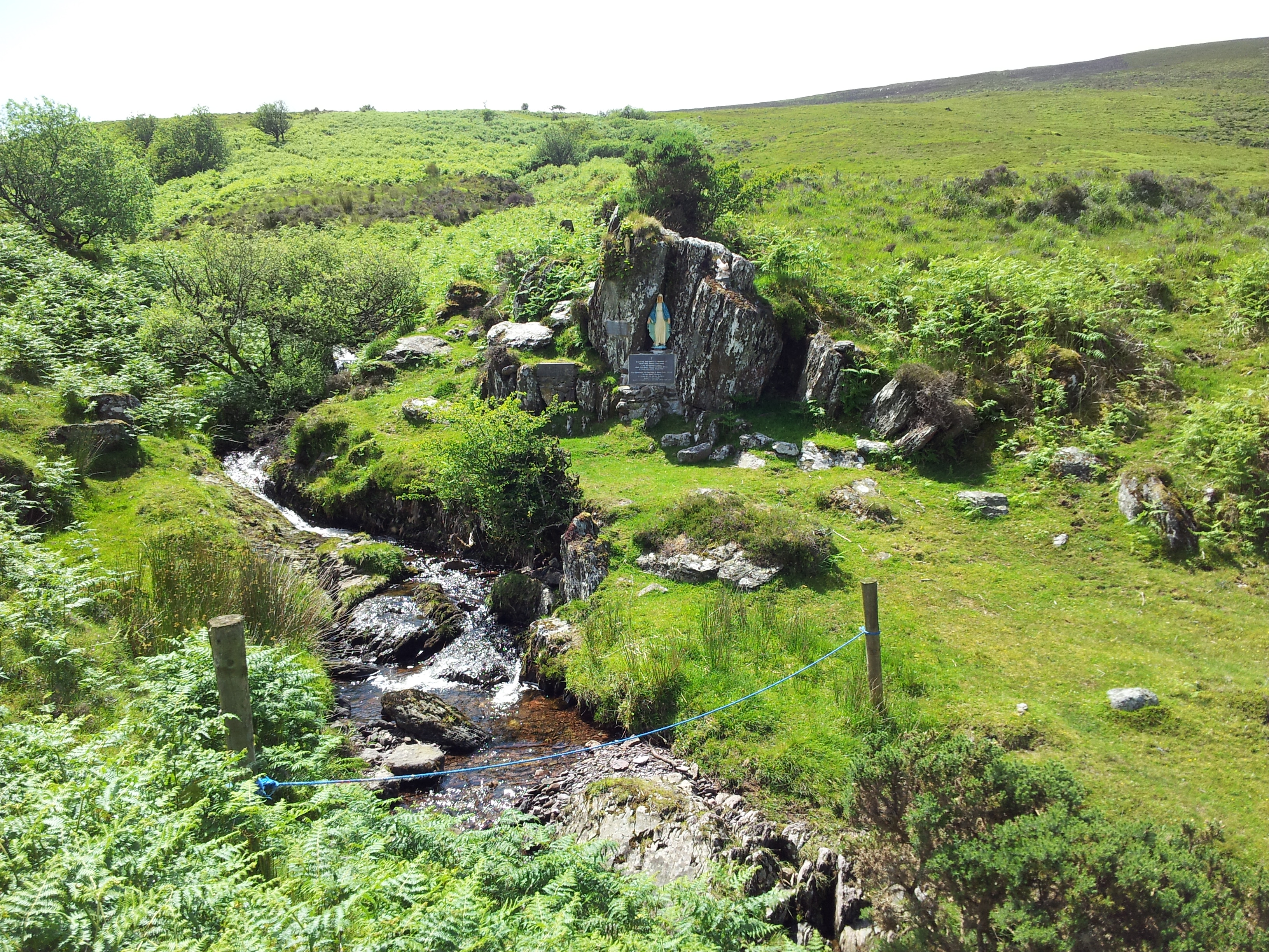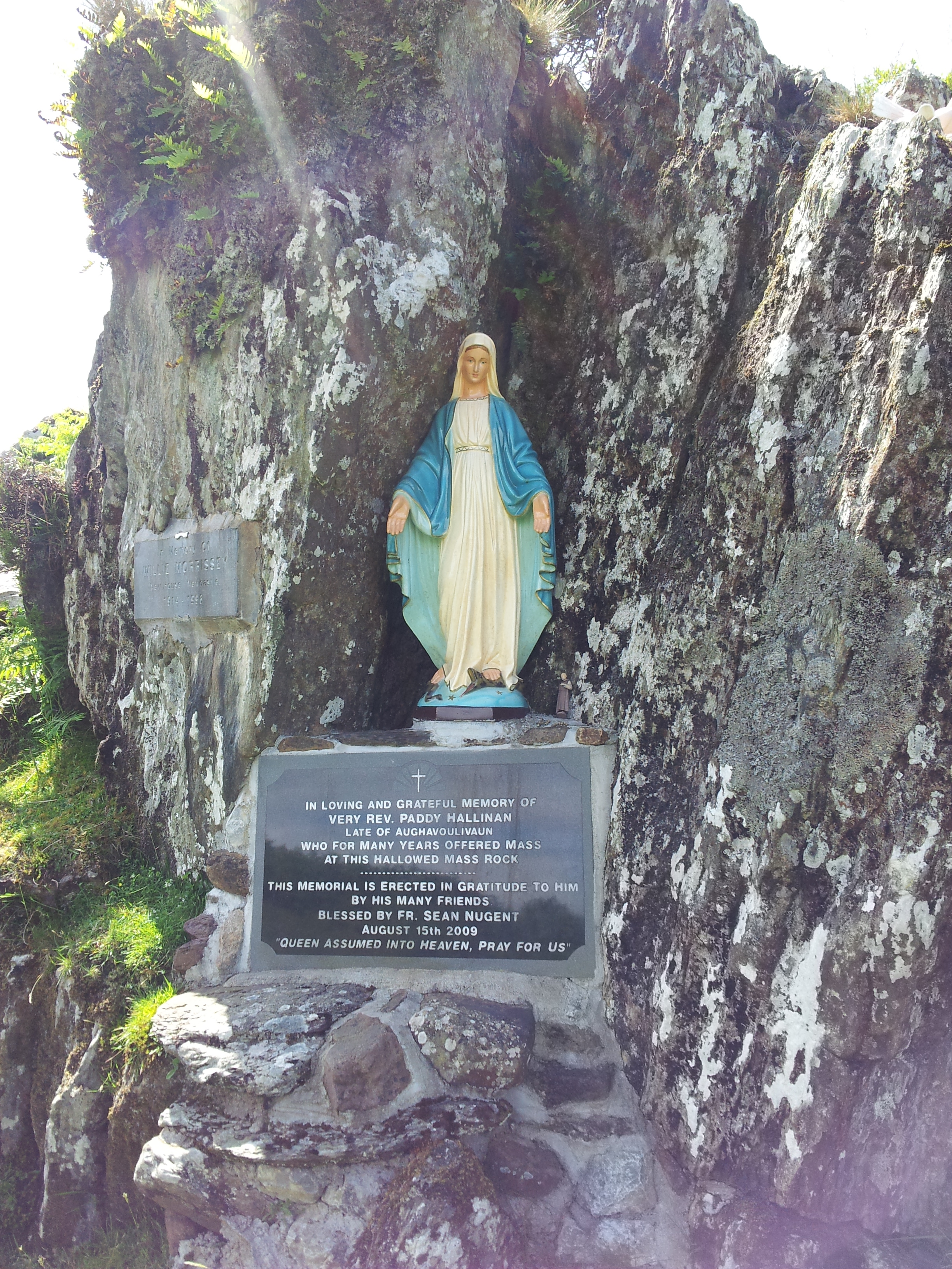 I first visited the  rock in 1999.  At the time the site consisted of a large rock outcrop with a memorial plaque  dedicated to Mr Morrisey and a modern granite block with a cross, inserted into the outcrop used as an alter. A number of jam jars were scattered around the rock (possibly to collect water from the stream). Rosary beads and ribbons were tied to the surrounding heather.