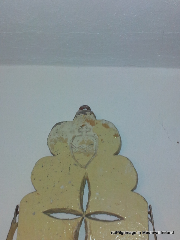 I am very interested in Irish folk art especially art relating to personal devotion in the 18th-19th century. As I wander around the exhibition within the house, I came across a small wooden plaque sitting above the fireplace now painted in a thick yellowish paint. The plaque has a cross design with a hand craved image of the the sacred heart above it. It has two tin metal straps on either side that were originally used to attach it to a wall. There is also a loop at the top which may also be have been used for attachment to a wall. At the base there is a strip of timber with nails which appears to be a more recent addition.