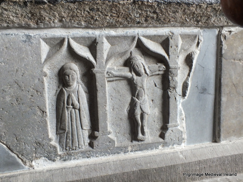 In the North side of the chancel of Holy Cross Abbey in Co Tipperary, an end slab of a chest tomb is built into the wall under the existing mensa. The scene depicts Christ flanked on either side by St John and Mary within ogee-headed niches. St John has been broken off the panel. Mary stands with her hands joined in prayer with her hair loose over her shoulders.