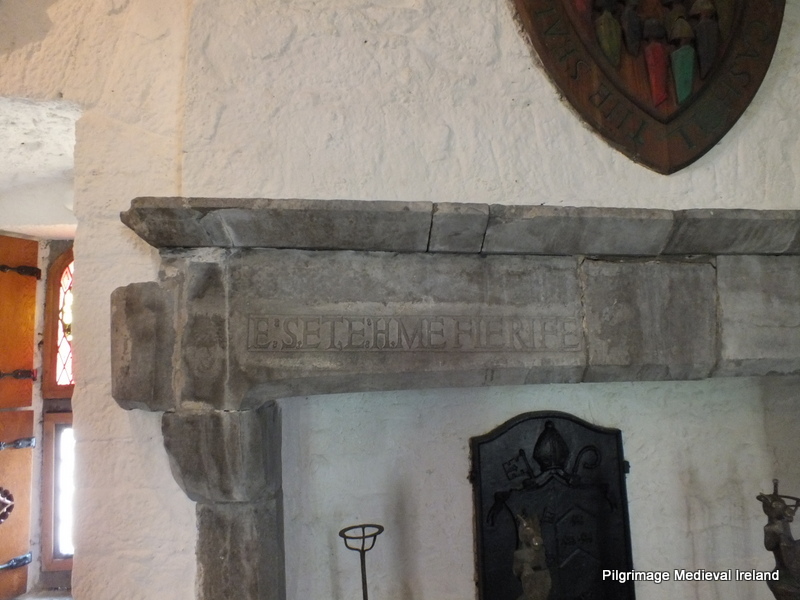 Within the inscription are tiny figure of eight and diamond shape with a circle attached. I thought these might be masons marks but archaeologist Eamonn Cotter told me these are full stops and it was common to have stop marks between letters or groups of letters on fireplace inscriptions ( as at Barryscourt Castle Co Cork).