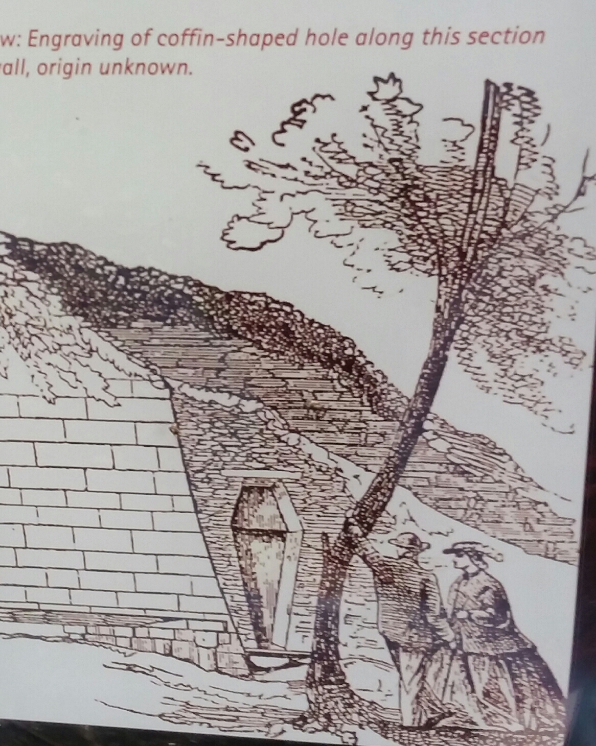 The church is surrounded by a really interesting historic graveyard located in the north-western corner of the town walls. The graveyard has a very unusual and interesting feature. This is a coffin-shaped recess built into the town walls. Tradition has it the recess was used to hold a coffin for pauper burials. Those who could not afford a coffin were place within this coffin temporarily during the burial process.