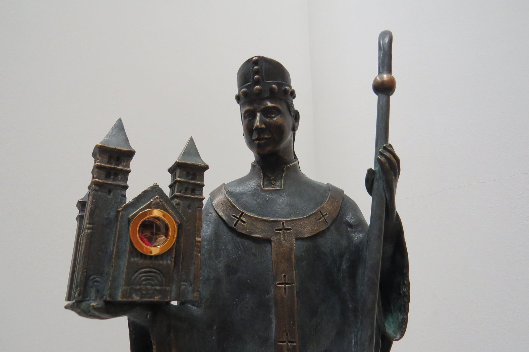 The Relic is a piece of his bone, and is contained within the rose window of a scale model of the Basilica of St. Willibrord, which a bronze statue of a young missionary St. Willibrord is holding in his right hand. He holds his crozier in his left hand. Willibrord is standing on a piece of sandstone taken from the remains of his original abbey, which is in the crypt of the Basilica