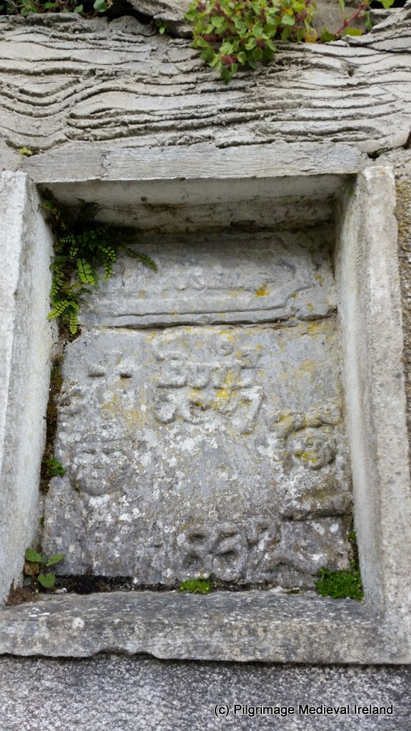 Further traces of the medieval past survive in architectural fragments incorporated into the modern graveyard wall. A stone plaque close to the main entrance to the graveyard and church which bears the inscription