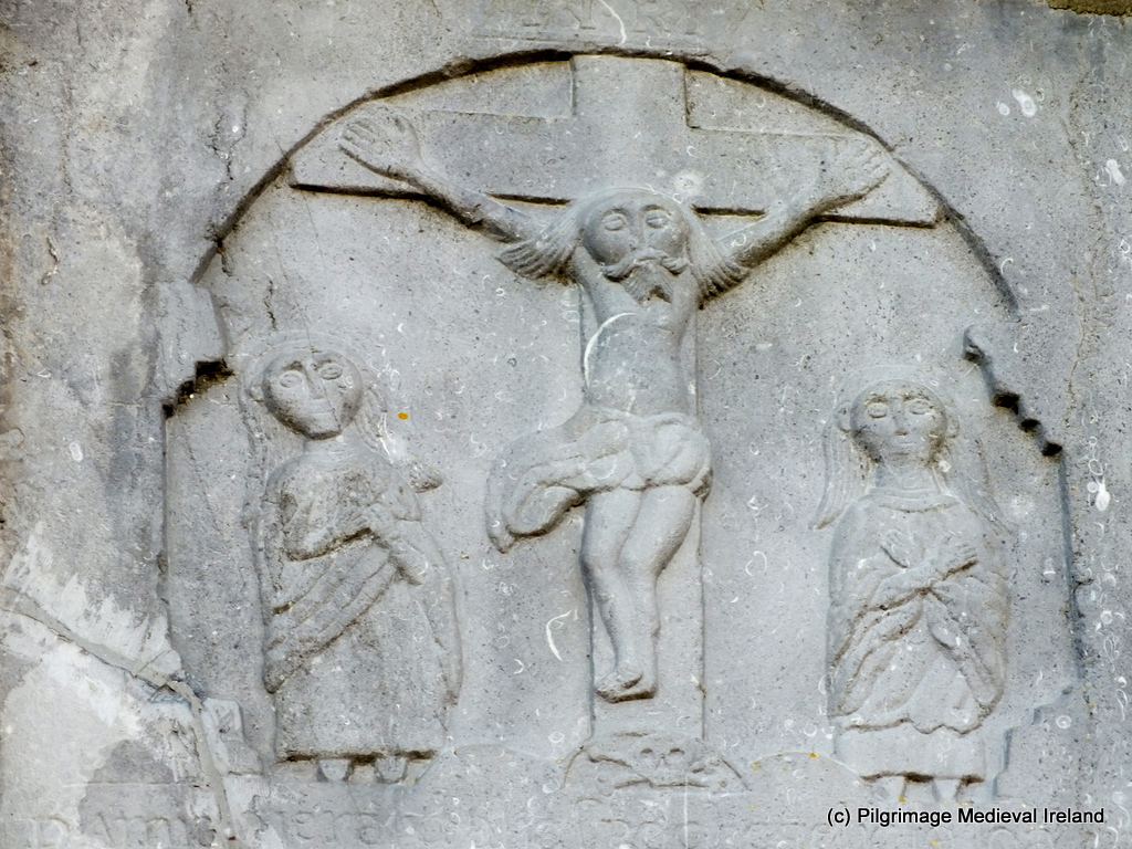 The Christ is flanked on either side by Our Lady and St John. Underneath the crucifixion scene is a latin inscription which translates as