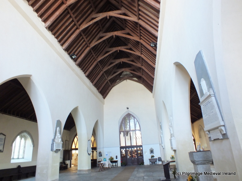 St Colman’s Church of Ireland sits across the street. This building has a modern appearance but much of its fabric dates to the medieval period. The church was originally built c.1270-80. It has a cruciform plan with an aisle-less choir, a nave with two aisles, two transepts and a chapter house projecting from the north side of the choir.
