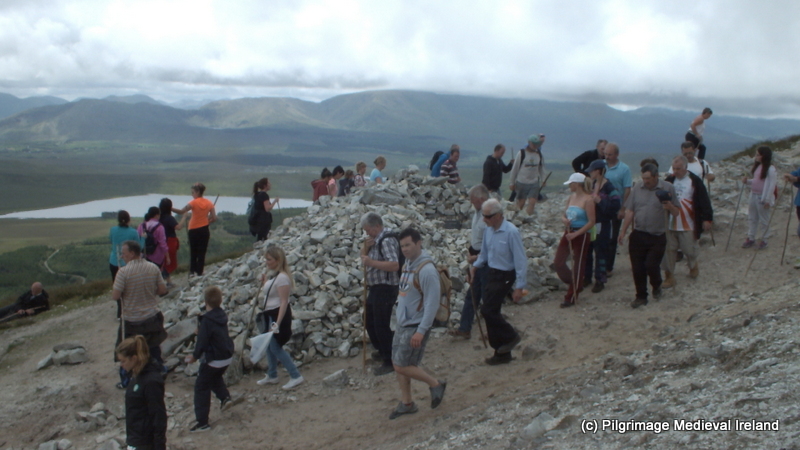 Traditionally  the final pilgrim station of the pilgrimage was a visit to large possible Bronze age enclosure called Roiling Mhuire (Virgin’s Cemetery) on the western side of the mountain. Three cairns of stones are found within the enclosure and the pilgrim walked 7 times round each cairn, saying 7 Our Fathers, 7  Hail Mary’s and 1 Creed and finally go round the whole enclosure seven times praying.  The majority of modern pilgrims skip this final stage and finish their pilgrimage on the summit.