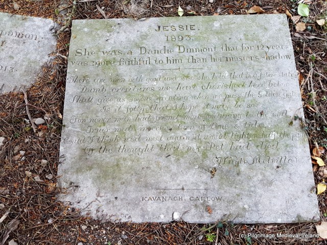 Judging from the sentiment of the memorial stone Jessie a Dandi Dinot , now a rare breed of terrier, was sorely missed by her master. I like to think she accompanied him on his archaeological explorations.