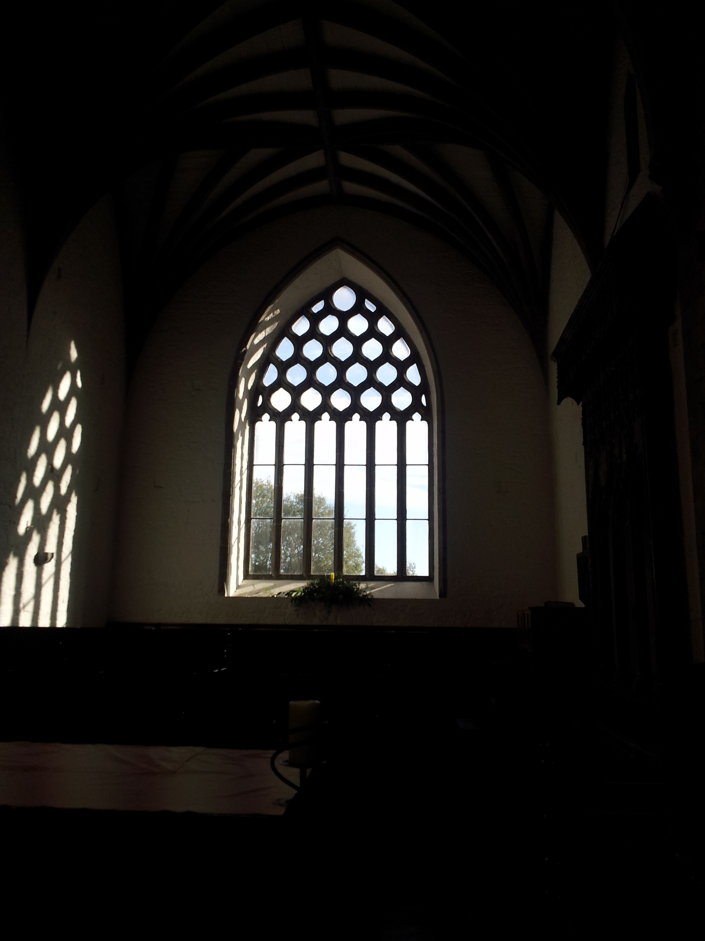 The church is entered through a doorway with hooded moulding in the west gable, which has been rebuilt in modern times.