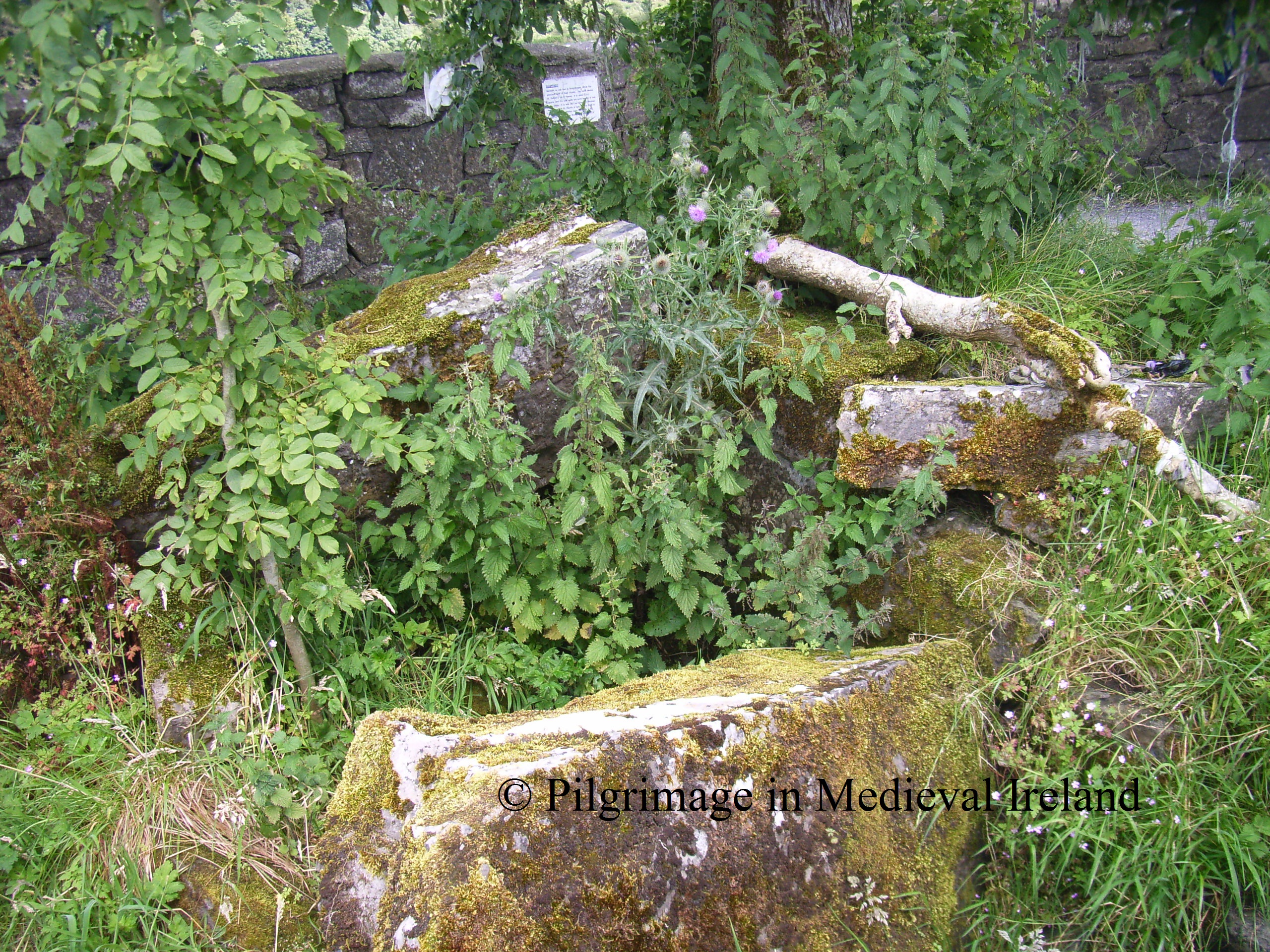 Tradition holds that St Féichín would kneel and pray here. In the past delicate and sick children were immersed here in the water to obtain a cure through the invocation of St Féichín. A similar practice occurred at Glendalough during the 19th century when pilgrims would immerse sick children in a pool called St Kevin’s Keeve. Both wells are likely to have been a focus of early and later medieval devotion.