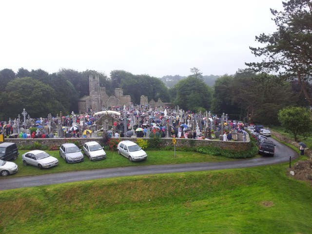 Mass began in the graveyard at 3. The weather was wet and a constant light rain was down for the afternoon, but despite the weather the graveyard was a see of coloured rain jackets and umbrellas.